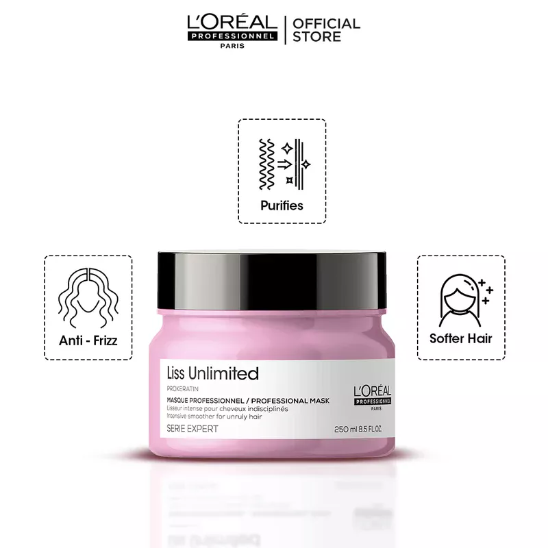 Experience the ultimate solution for rebellious, frizzy, and straightened hair with L’Oreal Professionnel Serie Expert Liss Unlimited Mask 250 ML enriched with pro keratin and kukui oil. It works as magic to purify, tame, and transform your hair into a glossy, frizz-free masterpiece that stays stunning for upto 4 days even at 80% humidity.